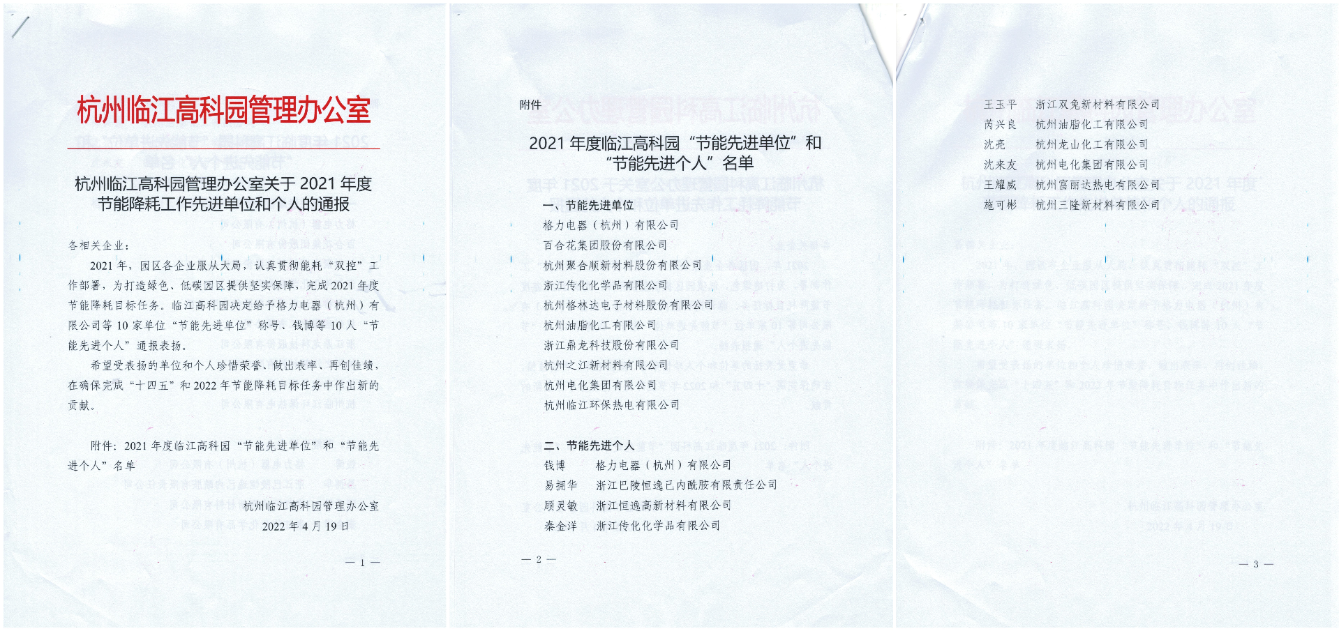 近日,杭州臨江高科園管理辦公室對2021年度節(jié)能降耗工作先進單位和個人進行通報表揚,集團公司和格林達公司榮獲“節(jié)能先進單位”稱號,氯堿分公司常務(wù)副總經(jīng)理沈來友榮獲“節(jié)能先進個人”稱號。